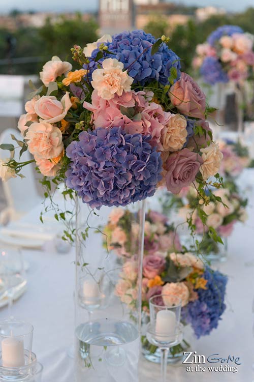 The top table was decorated with floral compositions in high and low glass vases and candles. Petra loved Hydrangeas, roses and carnations and as color palette she loved the blue color with a touch of cream and pale pink.