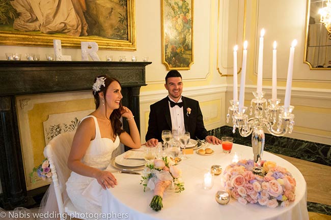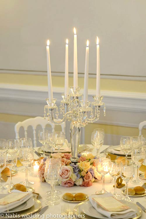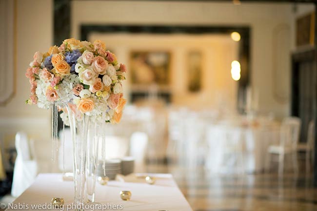 Flowers compositions were romantic and rich. Centrepieces were made with elegant crystal candelabras , wedding chairs decorated with a romantic garland and wedding stationery in peach and cream color.